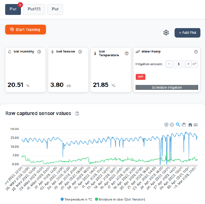 Our local Machine Learning models are continuouly re-trained on measured tension values and many other environmental parameters. The system learns from context data and continuously improves irrigation recommendations.